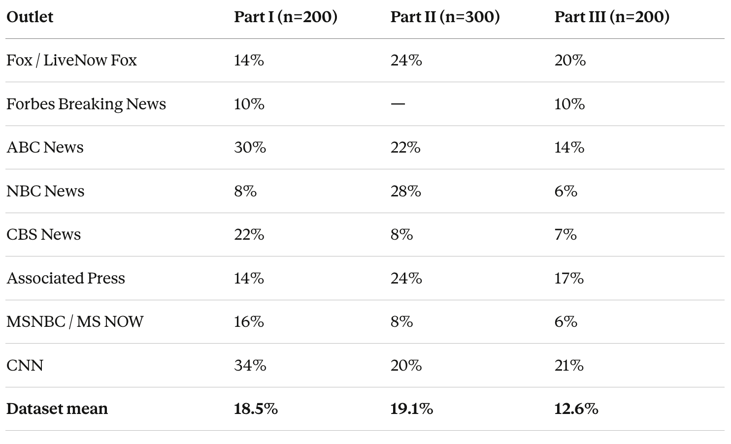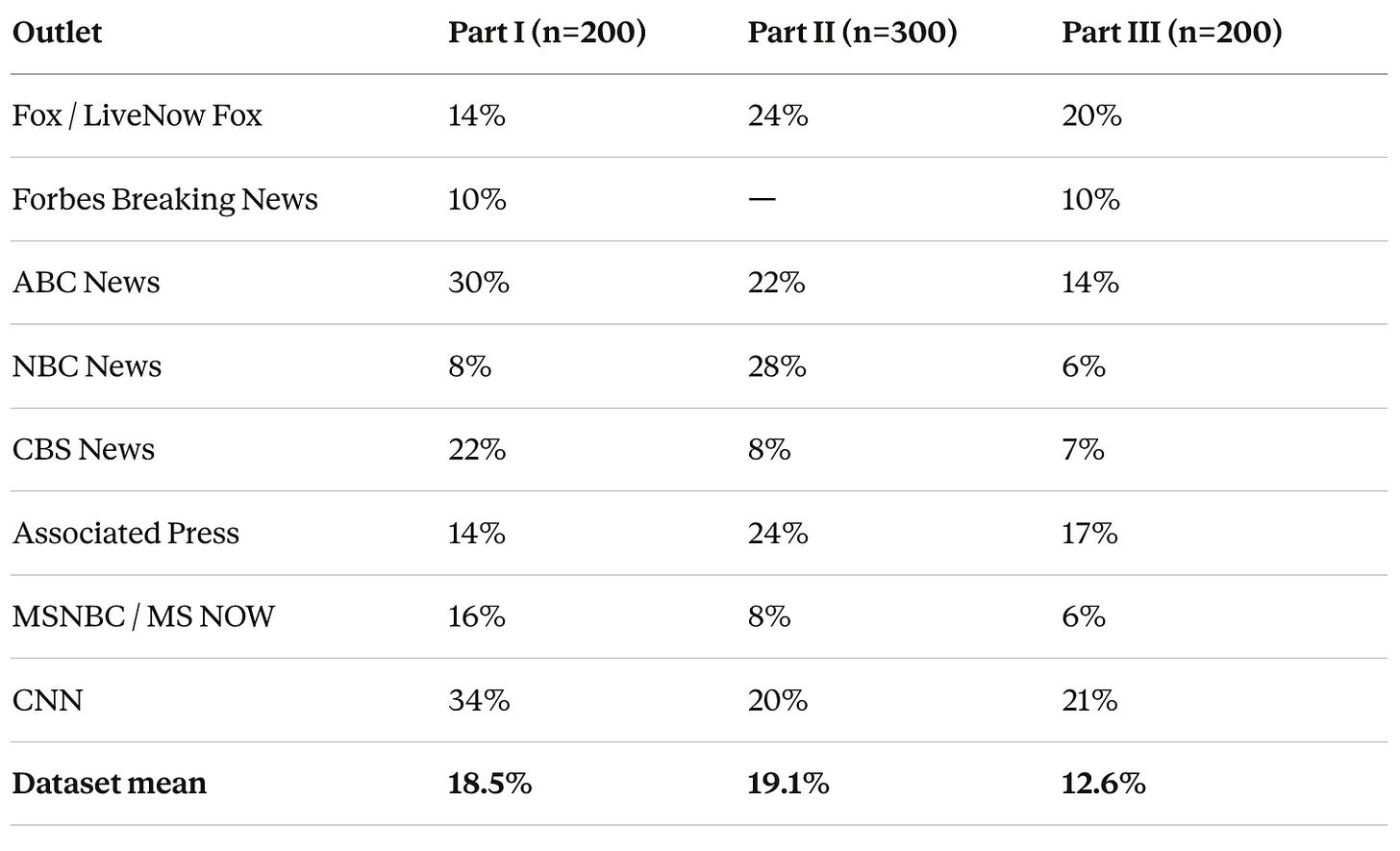 A note on cross-study comparability. All three studies in this series apply the same annotation protocol and counting unit. The lower mean antisemitic content rate in Part III (12.6%) compared to Parts I (18.5%) and II (19.1%) therefore does not reflect a methodological difference. As argued in the opening section of this article, the rate difference is better explained by a structural shift in discursive register — from theological demonology and Holocaust inversion, which dominated when Israel acted alone, to Power and Conspiracy narratives, which have become primary in the context of US co-belligerence. The total dataset for Part III comprises 1,600 comments across eight outlets at 200 comments each. Within-study outlet comparisons and cross-study directional observations remain analytically robust.