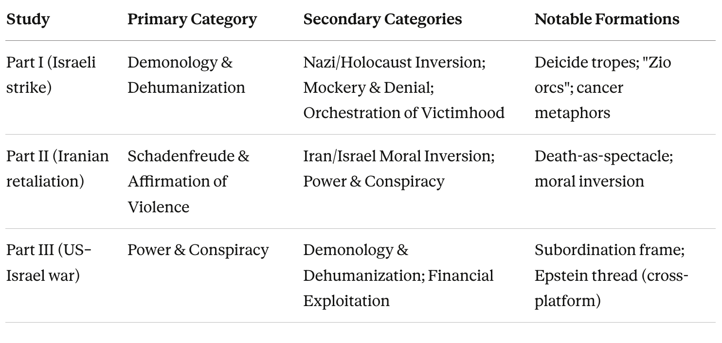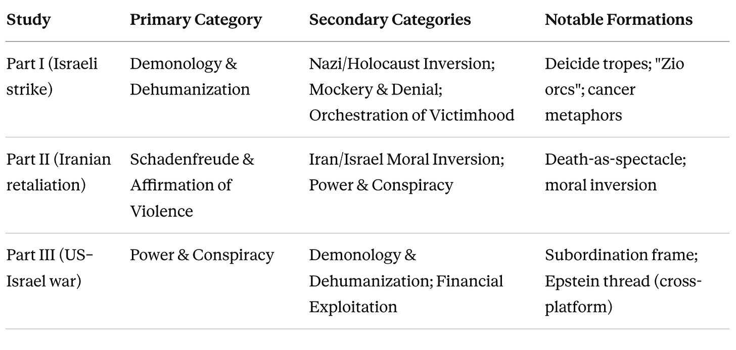 The trajectory across the three studies is analytically significant. Part I, responding to an Israeli military operation, generated the broadest and most theologically grounded antisemitic repertoire: demonization, deicide, Holocaust inversion, and the orchestration of victimhood. Part II, responding to Iranian retaliation, pivoted sharply toward affective registers — schadenfreude, death wishes, glorification of violence — as the moral inversion calculus was resolved in Iran’s favor and Jewish suffering became a source of satisfaction rather than contested meaning. Part III, responding to a qualitatively different war involving US co-belligerence and explicit regime change objectives, consolidates Power and Conspiracy as the dominant frame: the structural conditions of the conflict have given conspiratorial logic a factual scaffold, enabling it to displace the more explicitly theological and dehumanizing formations that characterized Part I while absorbing the affective intensity documented in Part II.