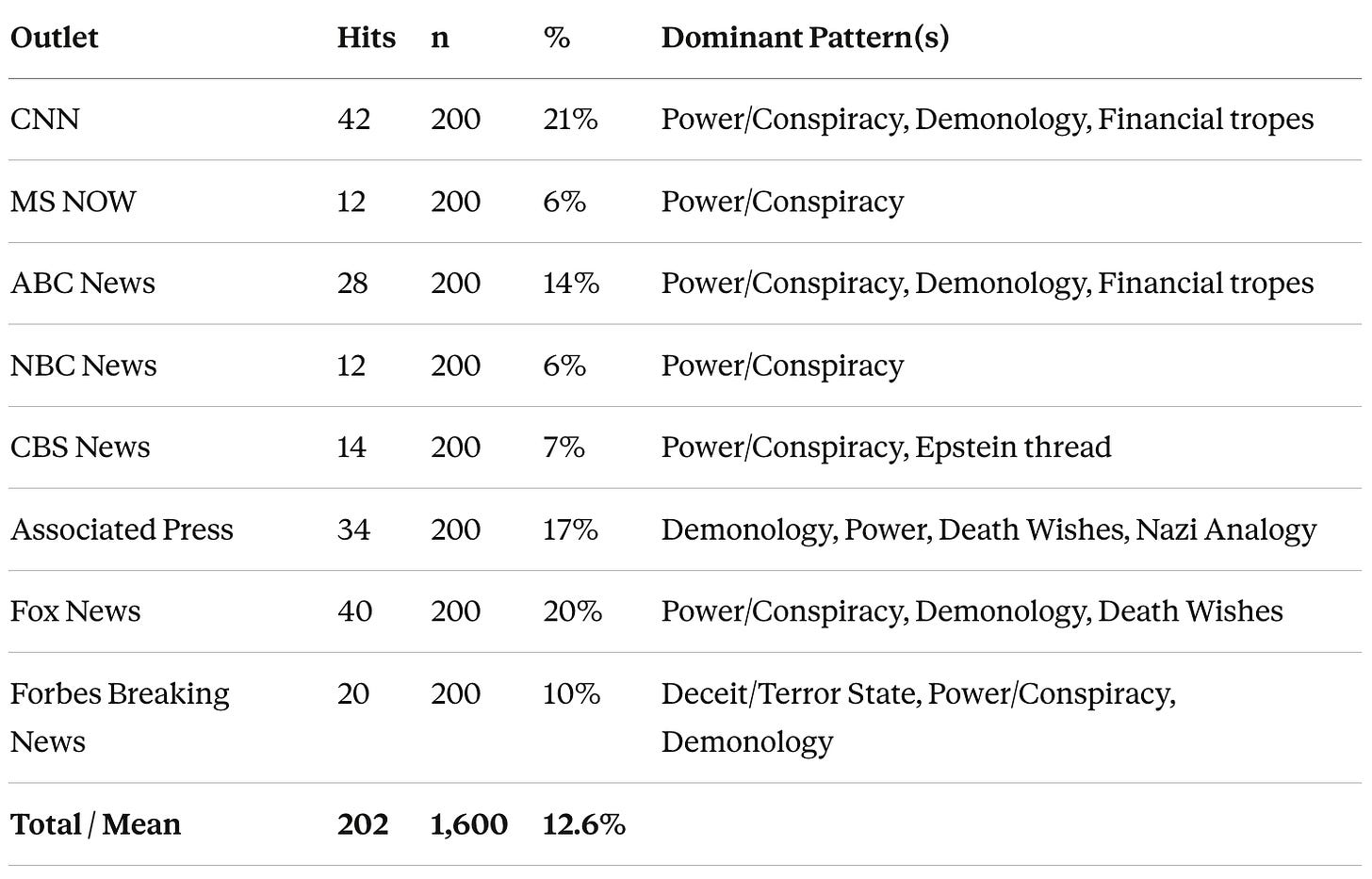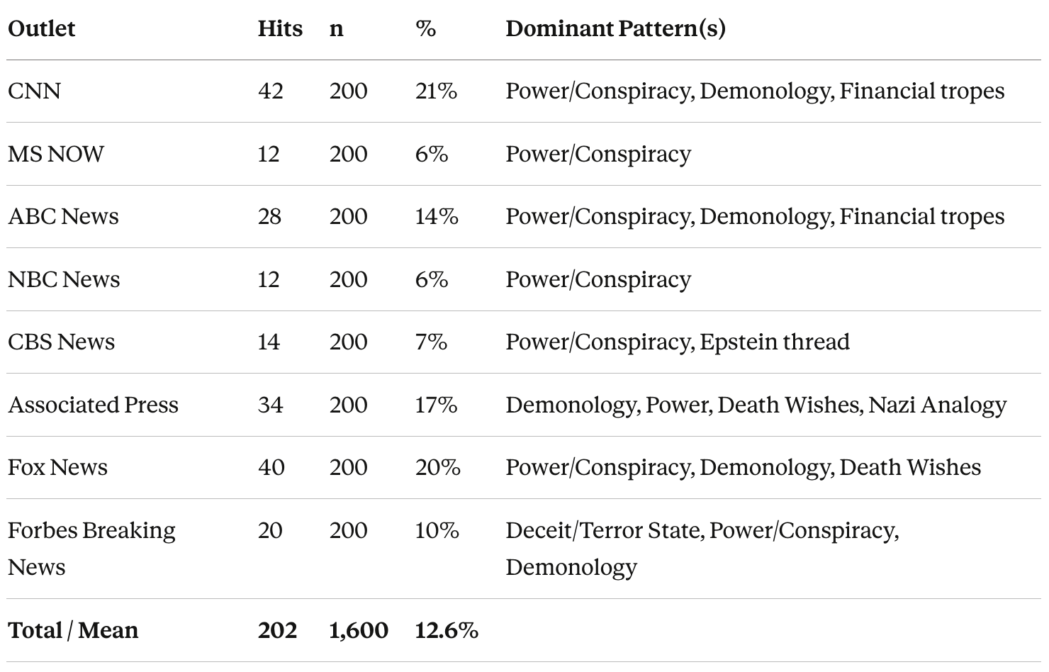 CNN (21%) and Fox News (20%) again lead the dataset — as they did in both June 2025 studies — confirming what is now one of the most consistent empirical findings across the series: antisemitic comment culture is a cross-ideological phenomenon. The outlet at the top of the left-leaning spectrum and the outlet at the top of the right-leaning spectrum produce near-identical antisemitic response rates, separated in Part III by a single percentage point. The surface framings differ — CNN comment sections tend toward financial conspiracy and theological demonology; Fox News toward subordination, death wishes, and Epstein distraction narratives — but the underlying antisemitic logic is structurally homologous. This symmetry is analytically significant precisely because it resists reduction to a partisan explanation: antisemitism in these comment ecosystems is not a pathology of the right or the left but a cross-ideological formation that draws on a shared repertoire of tropes, adapted to the rhetorical register of each platform’s audience. The Associated Press produces the most diverse repertoire — spanning all five analytical categories, including the only unambiguous Nazi Analogy and the most extreme Death Wish formulations in the corpus. Forbes Breaking News, absent from Part II and appearing here with a complete sample for the first time, contributes a distinct Deceit/Terror State framing alongside Power and Conspiracy content, and introduces the “The Jews wanted it, so the USA must do it” formulation as one of the most explicit statements of Jewish command over American foreign policy in the dataset.