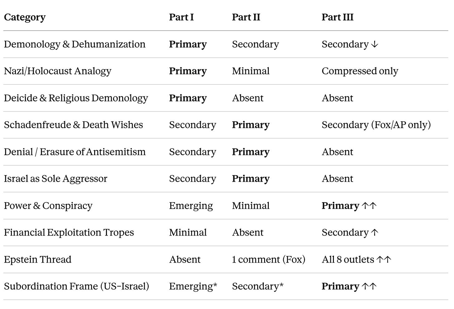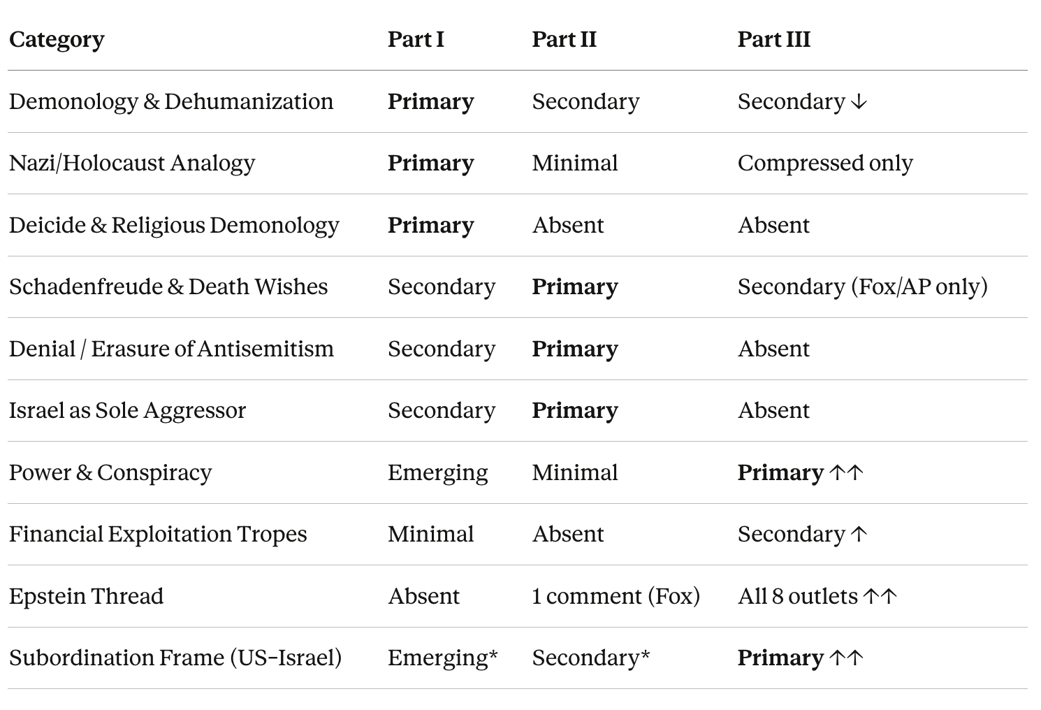Several findings from this table warrant analytical emphasis. First, the theological register — deicide, Satan, synagogue of Satan, religious demonology — is prominent in Part I and entirely absent by Part III. Its disappearance is not incidental: these formations depend on Israel as a metaphysically singular evil. The presence of US co-belligerence disrupts that singularity. Second, the Nazi/Holocaust Analogy, which appeared in expansive and explicit form at CNN and ABC in Part I (”modern-day Hitler,” “doing to others what was done to them”), survives in Part III only in compressed, portable shorthand — “ZioNAZIs” as a single portmanteau — adapted to a context where the analogy can no longer bear the full weight it carried when Israel acted alone. Third, Power and Conspiracy narratives follow the inverse trajectory: emerging in Part I, minimal in Part II, dominant across all eight outlets in Part III. The Epstein thread — a single isolated comment at Fox News in Part II — consolidates into a near-ubiquitous cross-platform formation in 2026, appearing at all eight outlets under the portmanteau “Trumpstein.”