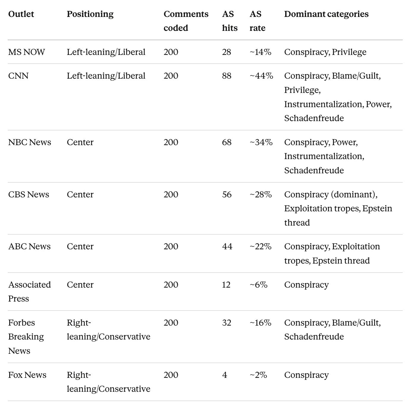 Forbes Breaking News (32 hits, ~16%): The most ideologically extreme content in the dataset at the individual comment level, including the only instances of explicit Nazi citation and Holocaust denial in the corpus. Conspiracy narratives dominate, with notable instances of Blame and Guilt, Schadenfreude, and Privilege arguments.