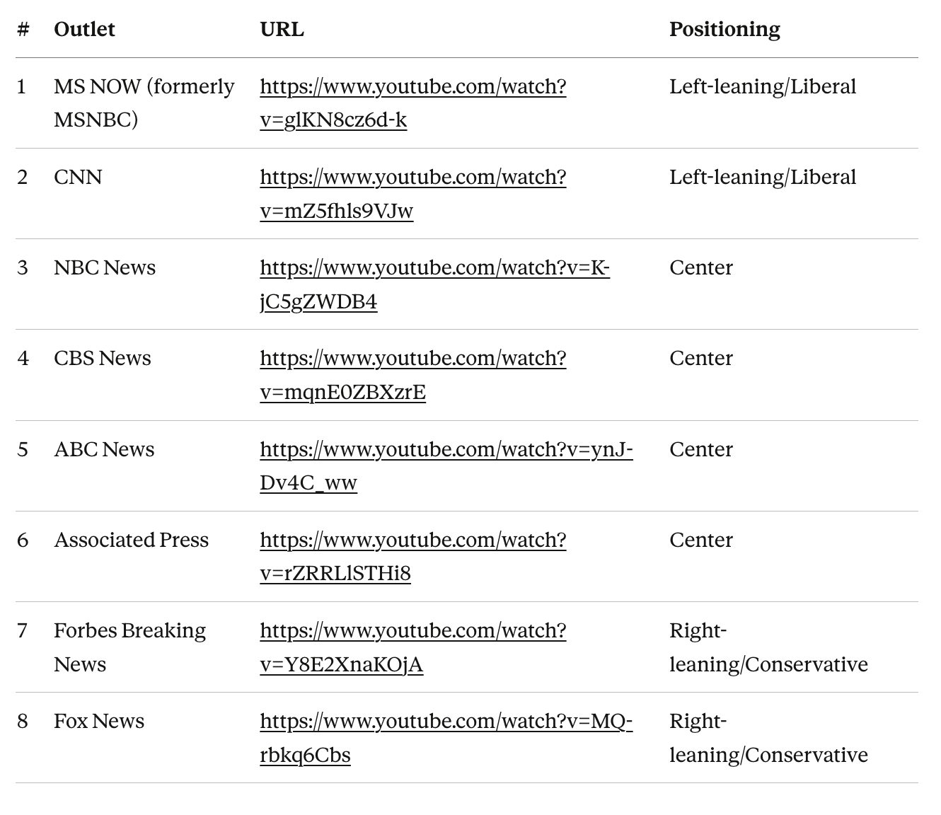 Several outlets published multiple videos covering the attack; for methodological consistency, only the first published video per outlet was analyzed. PBS NewsHour was excluded as comments were disabled; NPR was excluded due to insufficient comment volume; Breaking Points (Krystal Ball & Saagar Enjeti) published no coverage of the event.